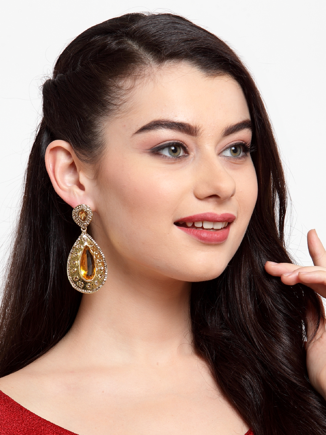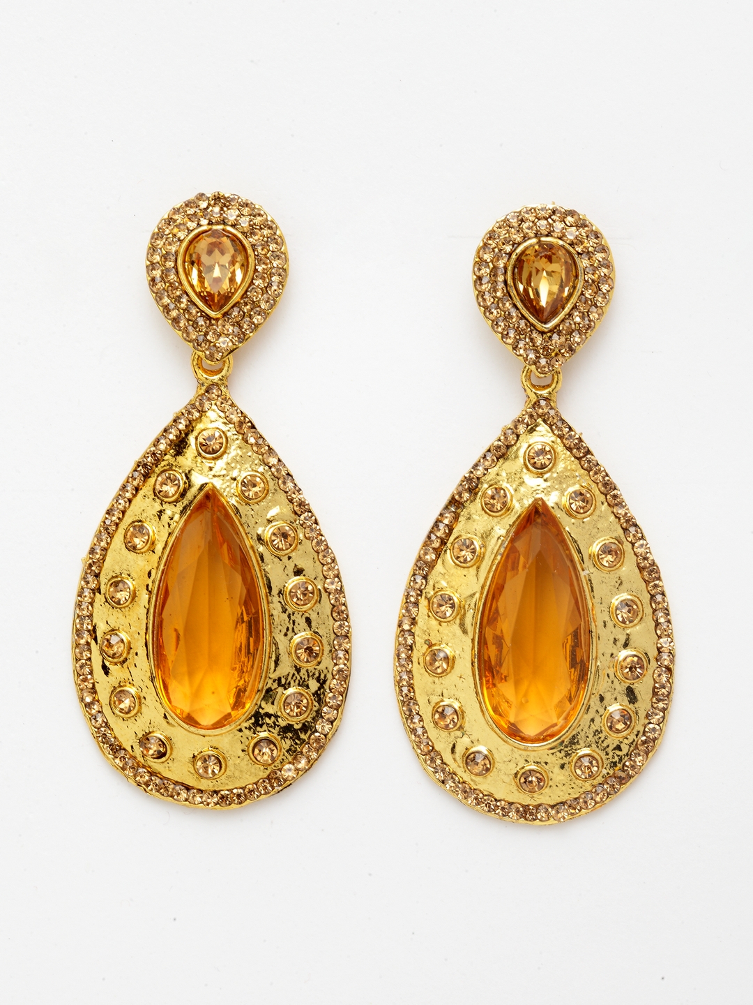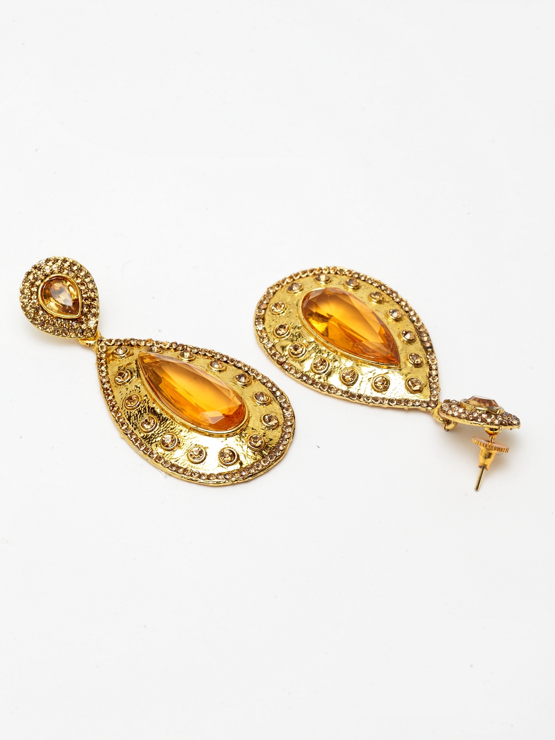 Traditional gold plated cubic zircornia studded brass big stone drop earring, secured with post and back closure