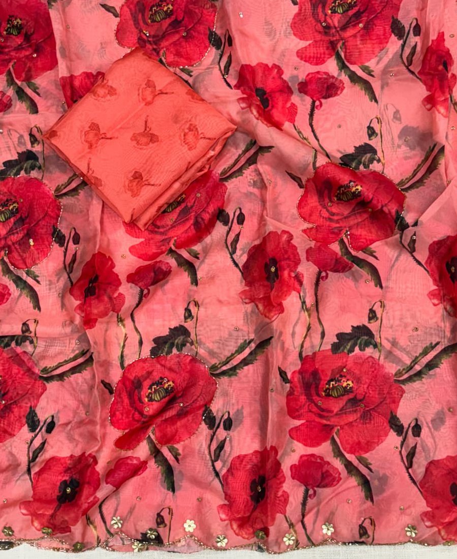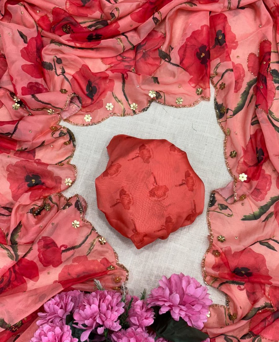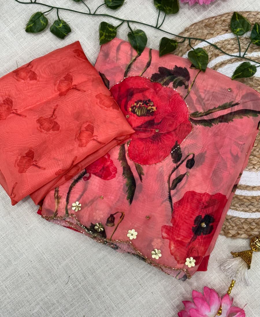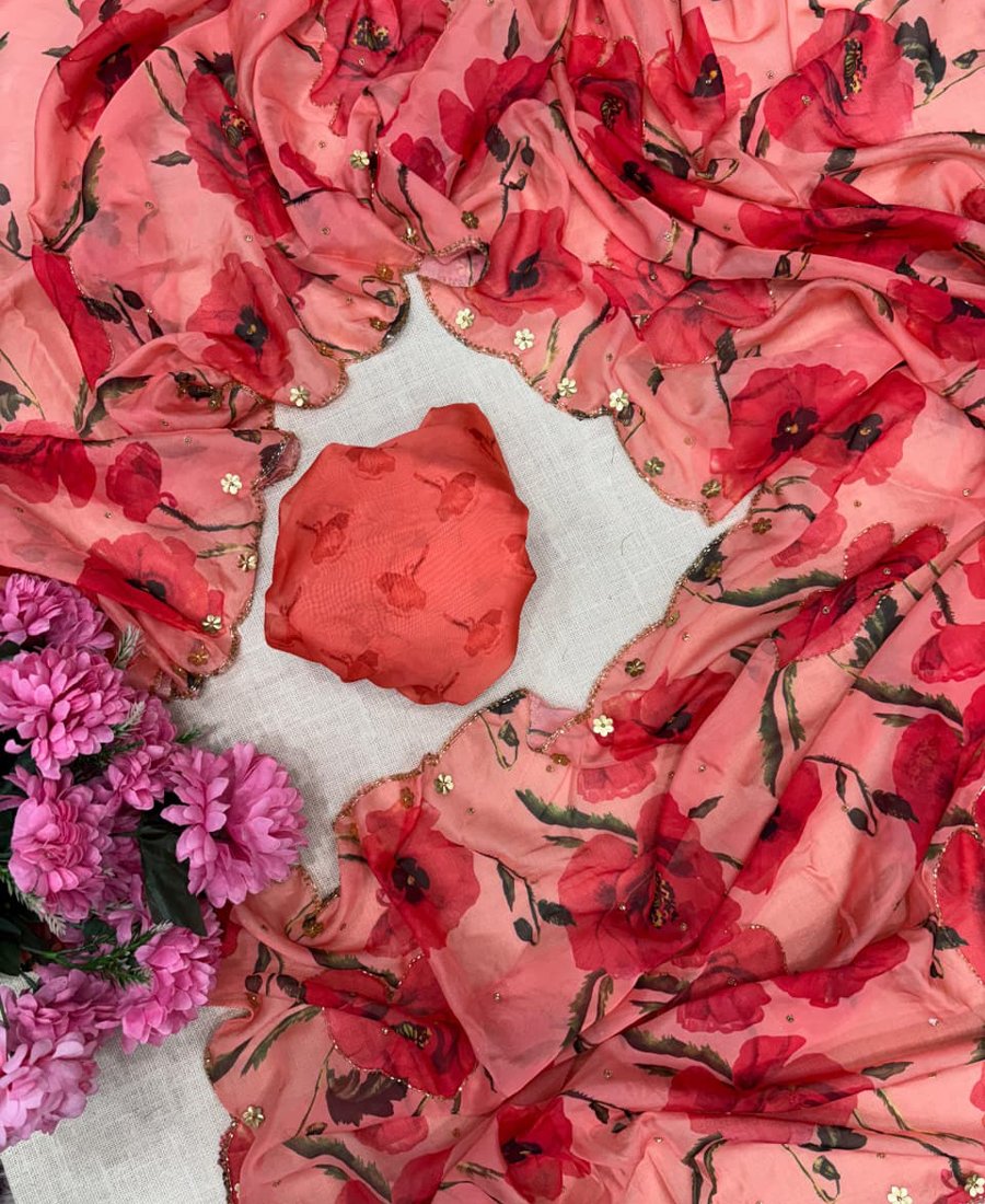 Trandy Red Tabby Silk Floral Print Saree For Women With Hand Embroidery