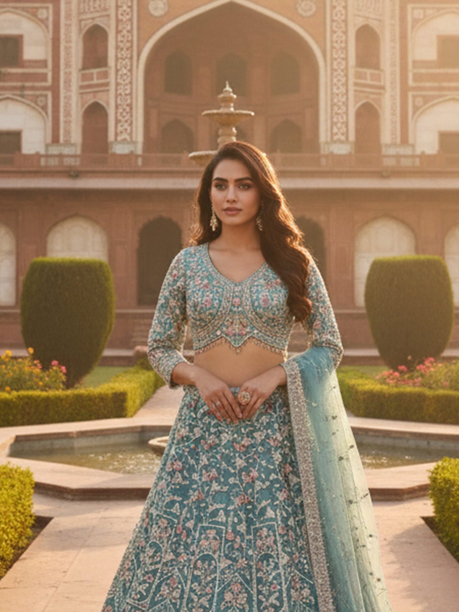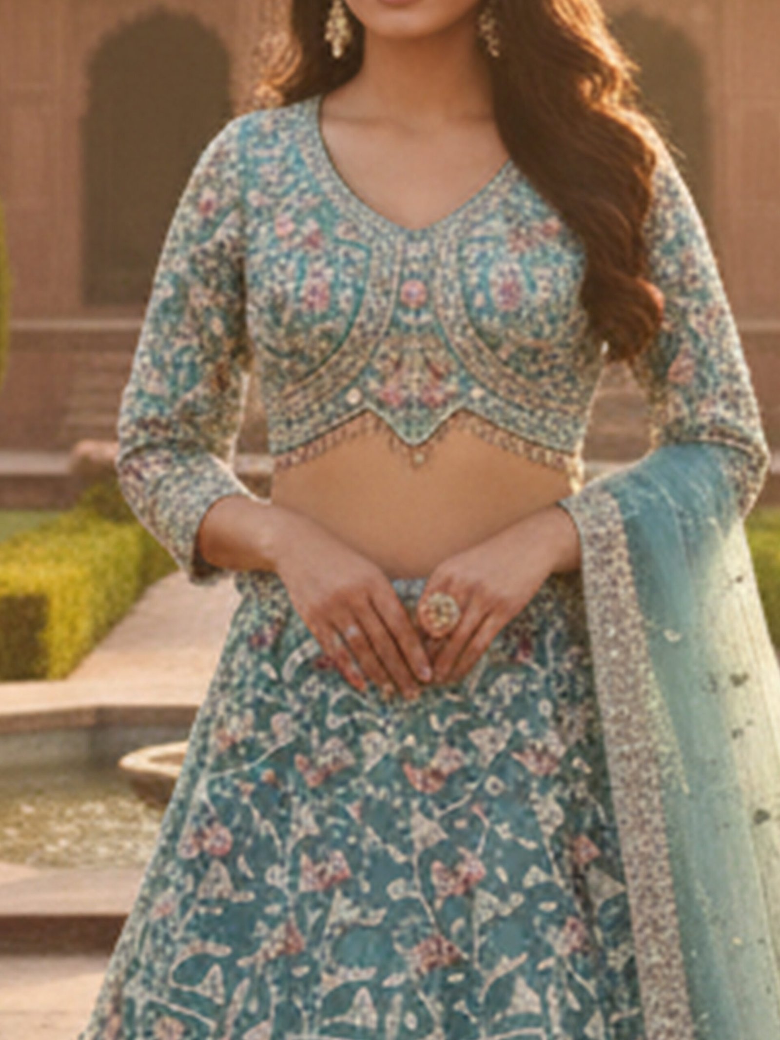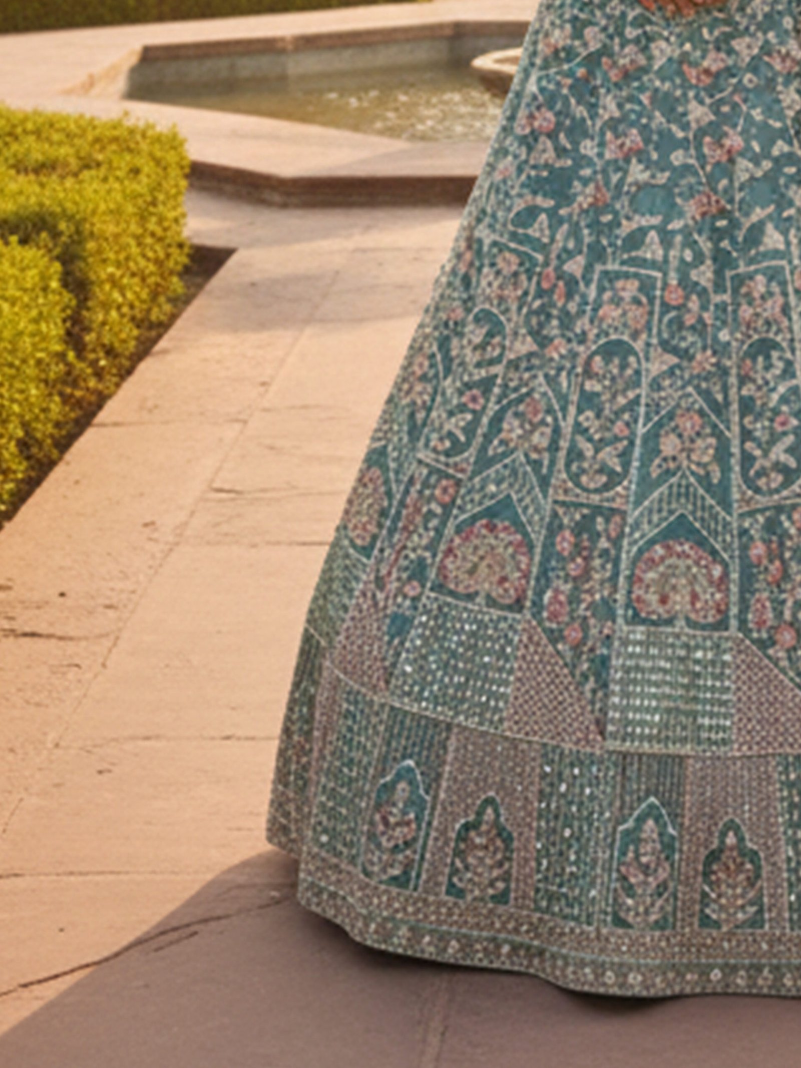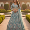 The Teal Noor Heirloom Hand-Embroidered Bridal Lehenga Set is a graceful blend of traditional craftsmanship and contemporary elegance. Crafted in a rich teal hue, the lehenga features elaborate hand embroidery with floral and architectural motifs, complemented by finely detailed panels and ornate borders that create a regal, flowing silhouette.
