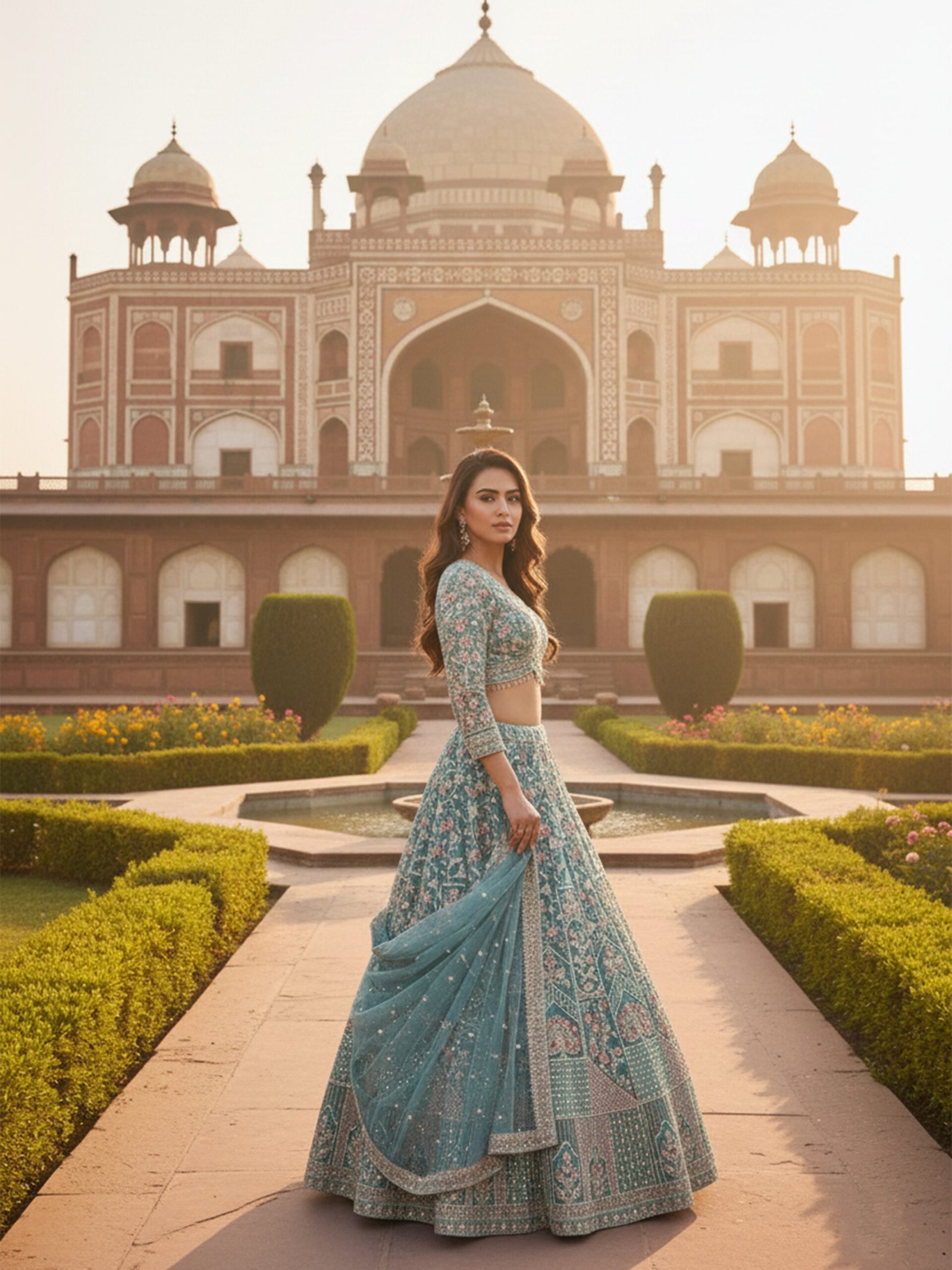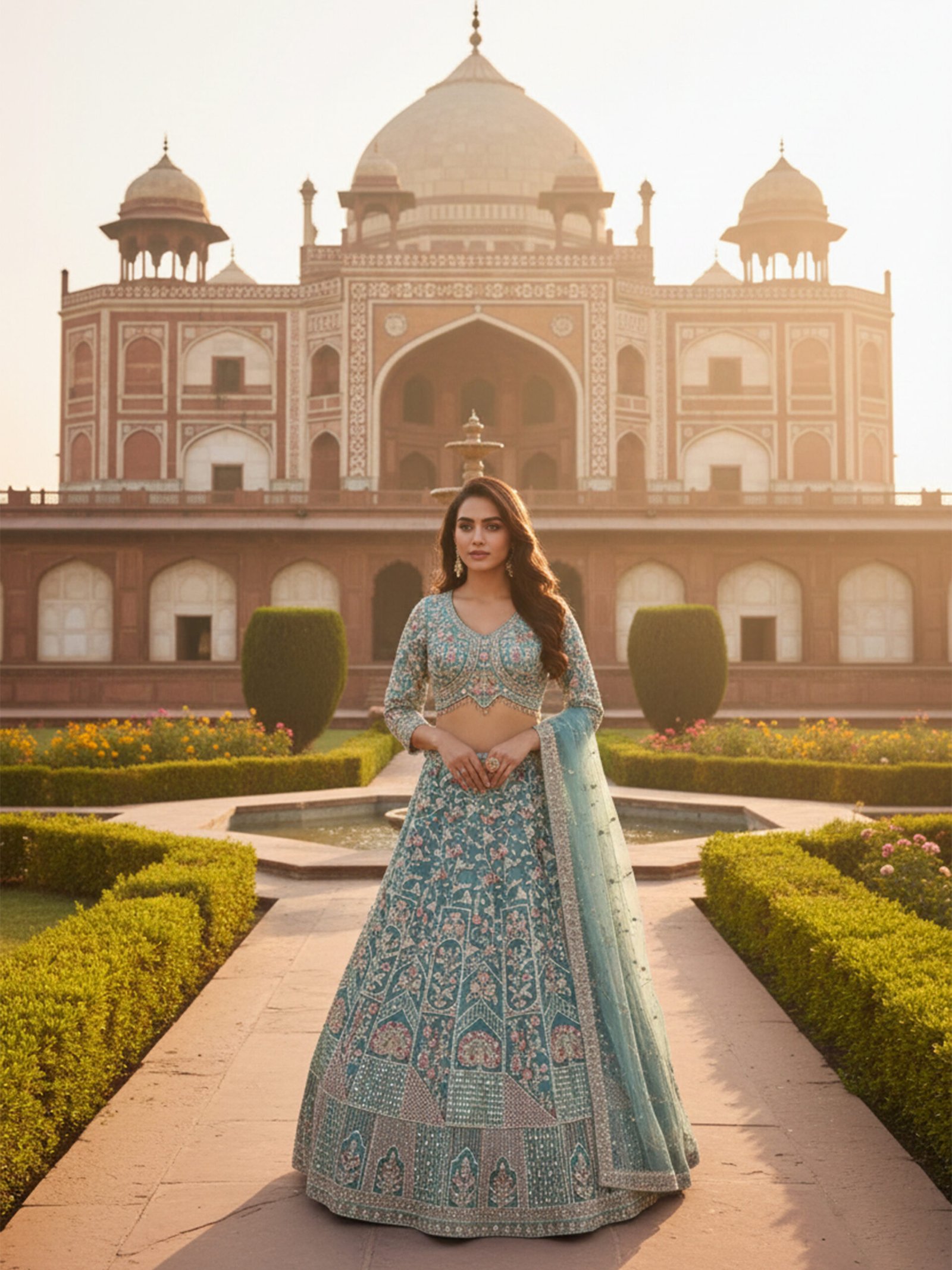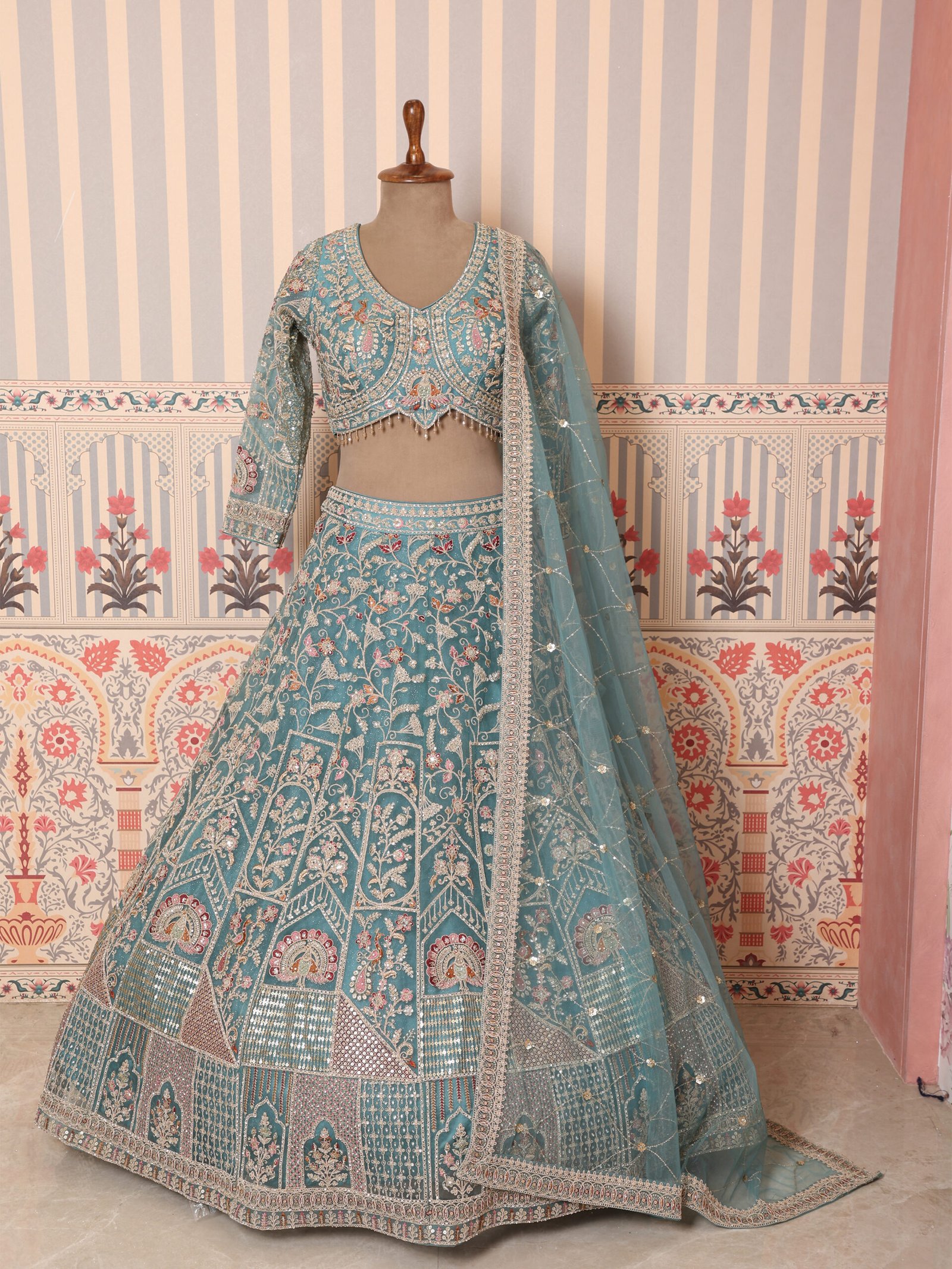 The Teal Noor Heirloom Hand-Embroidered Bridal Lehenga Set is a graceful blend of traditional craftsmanship and contemporary elegance. Crafted in a rich teal hue, the lehenga features elaborate hand embroidery with floral and architectural motifs, complemented by finely detailed panels and ornate borders that create a regal, flowing silhouette.