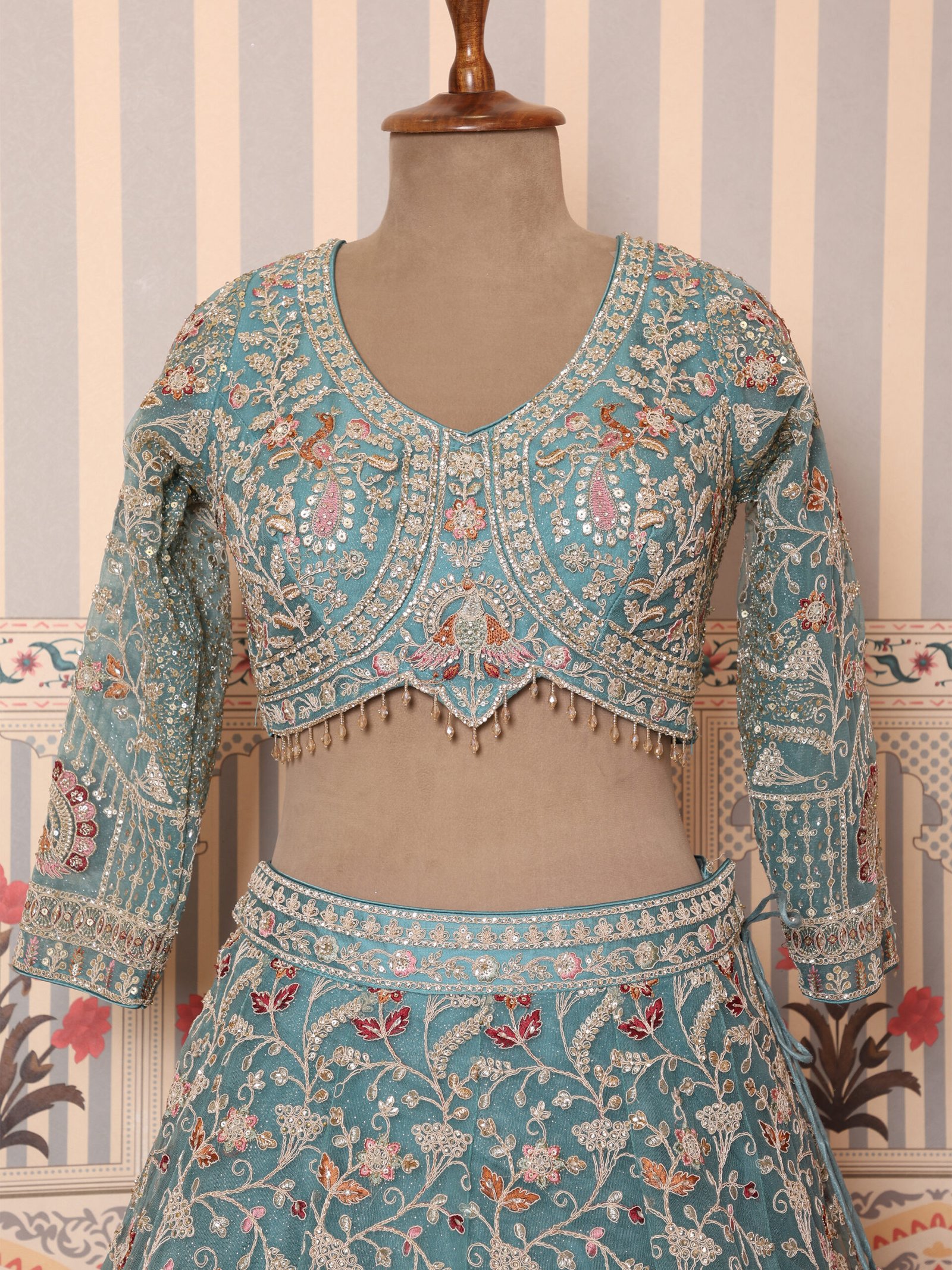 The matching blouse is beautifully embellished to enhance the lehengaโs intricate detailing, while the sheer embroidered dupatta adds lightness, movement, and sophistication to the ensemble. Every element reflects skilled artistry, making this lehenga a timeless choice for brides who appreciate refined luxury.