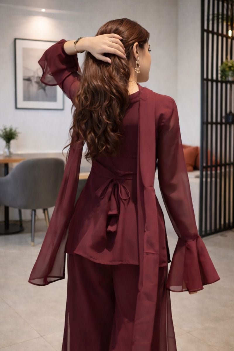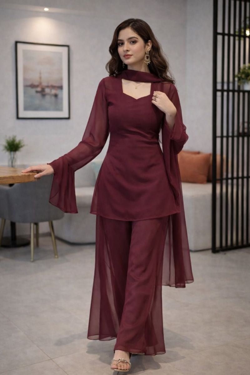 Upgrade your ethnic wardrobe with the Wine Georgette Kurta Palazzo Set. Designed with elegant styling and comfortable fabric, this outfit is ideal for festive celebrations, family functions, and traditional events.
