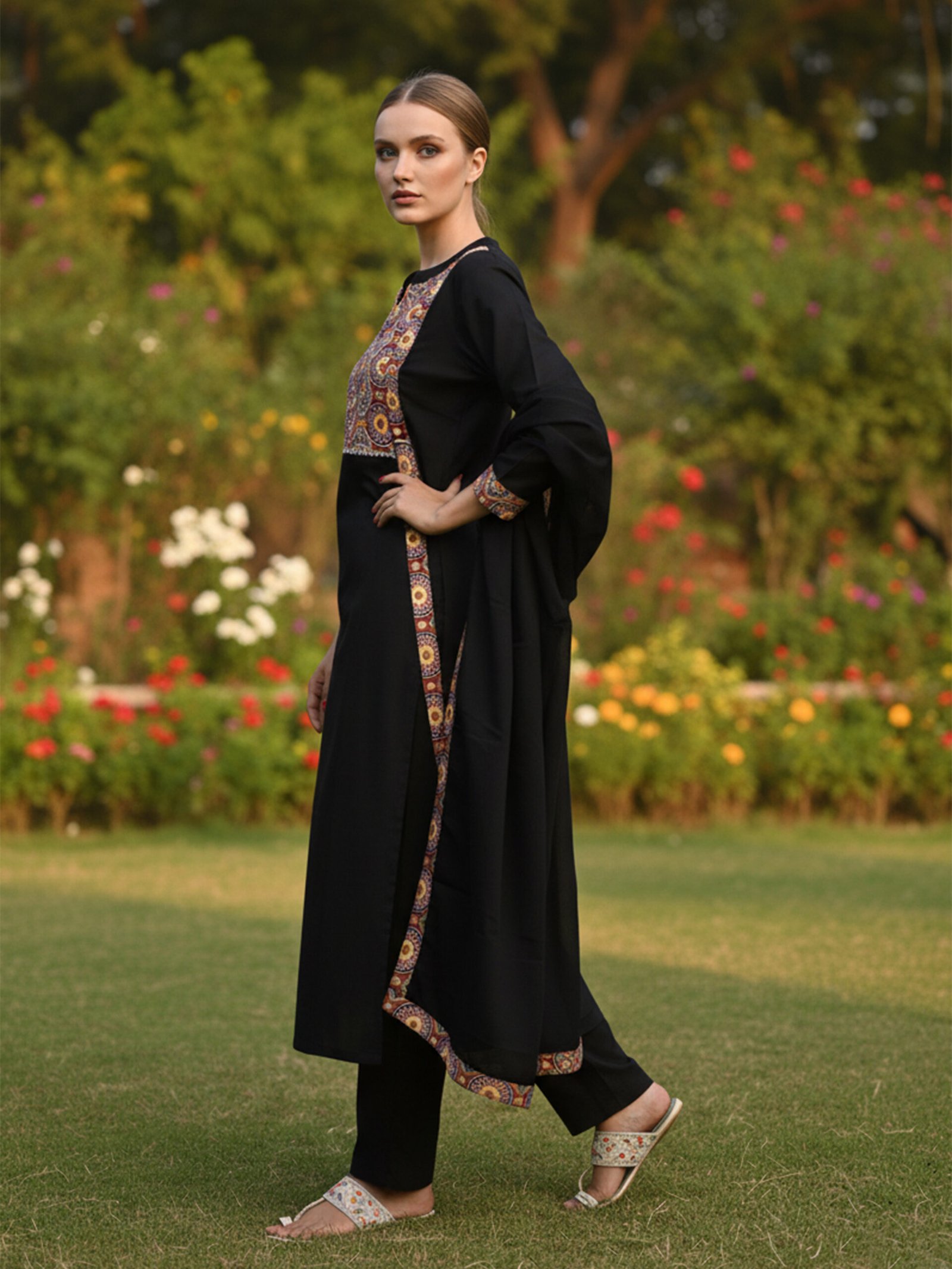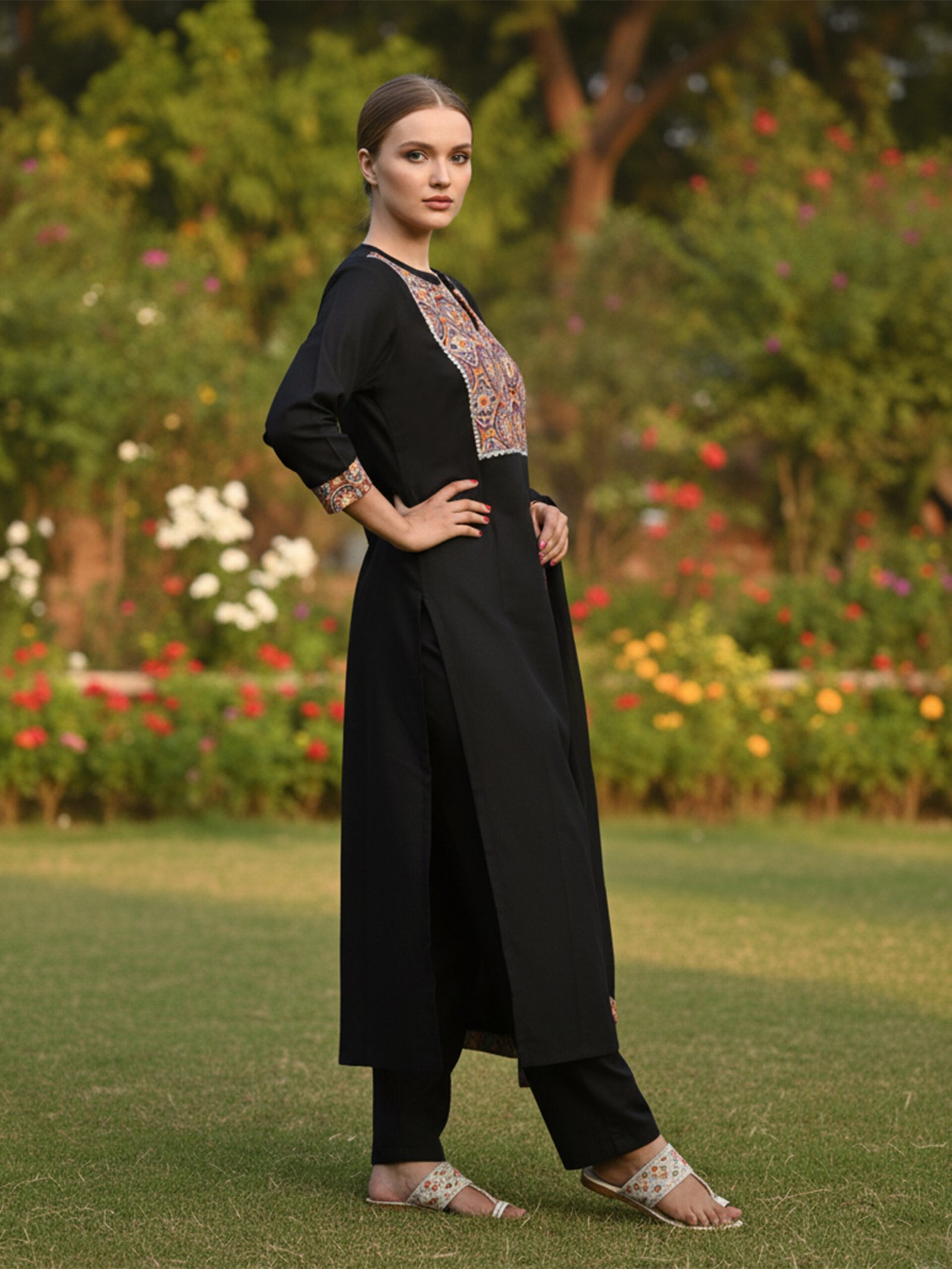 Make a bold, unforgettable statement at your next evening event. This premium black kurta set uses a deep, rich canvas to highlight heavy, stunning metallic embroidery across the bodice and side slits. The luxurious drape of the fabric combined with the striking embellishments offers a highly sophisticated, upscale look. Paired with matching tailored trousers, it is a masterclass in modern, empowering evening wear.