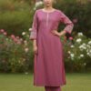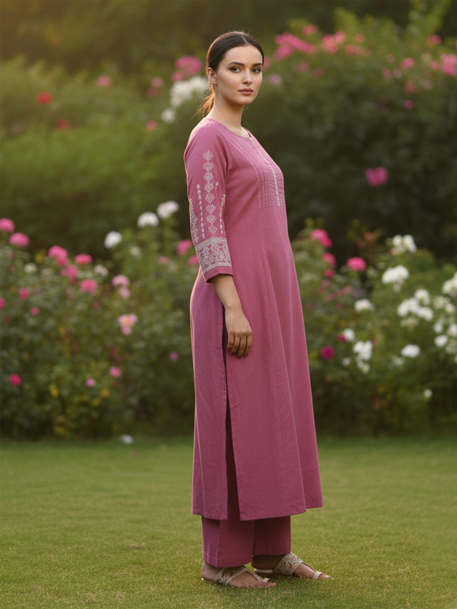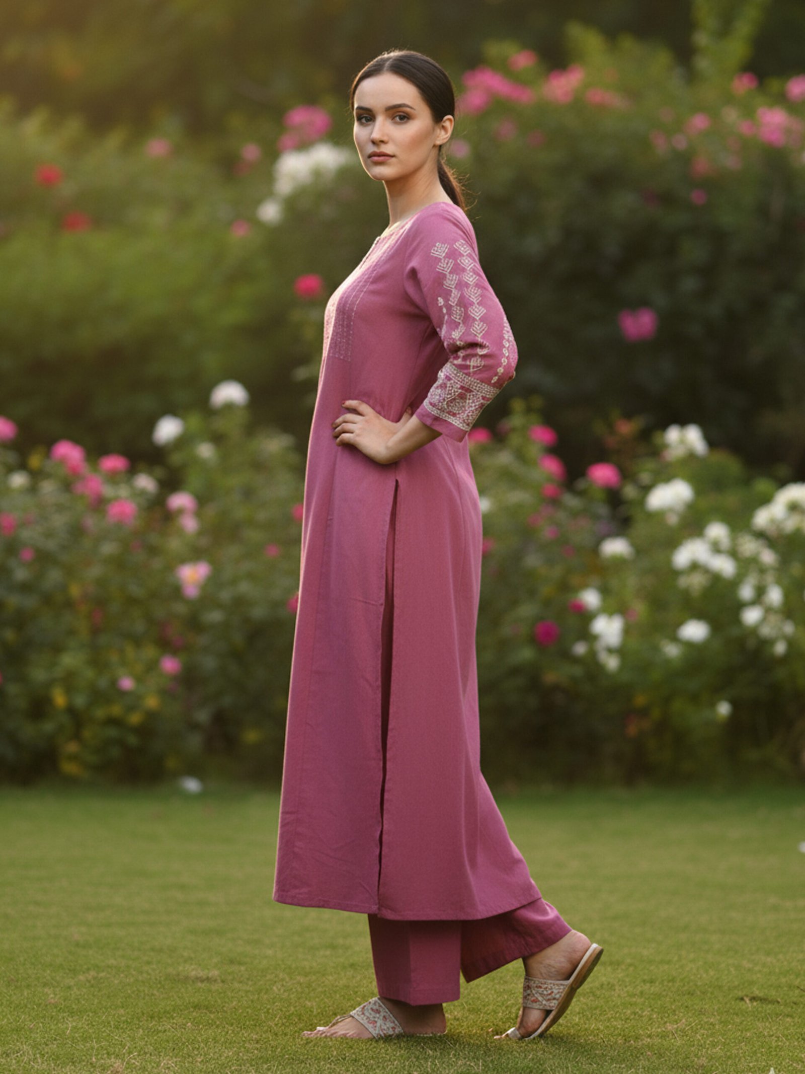 Embrace modern femininity with this beautifully tailored dusty rose kurta set. The soft, muted color palette is instantly elevated by highly detailed, contrasting embroidery that perfectly frames the neckline and sleeves. Crafted from a premium, fluid fabric, this matching top-and-trouser set provides an elongated, graceful silhouette that is highly versatile for both daytime celebrations and upscale dinners.