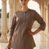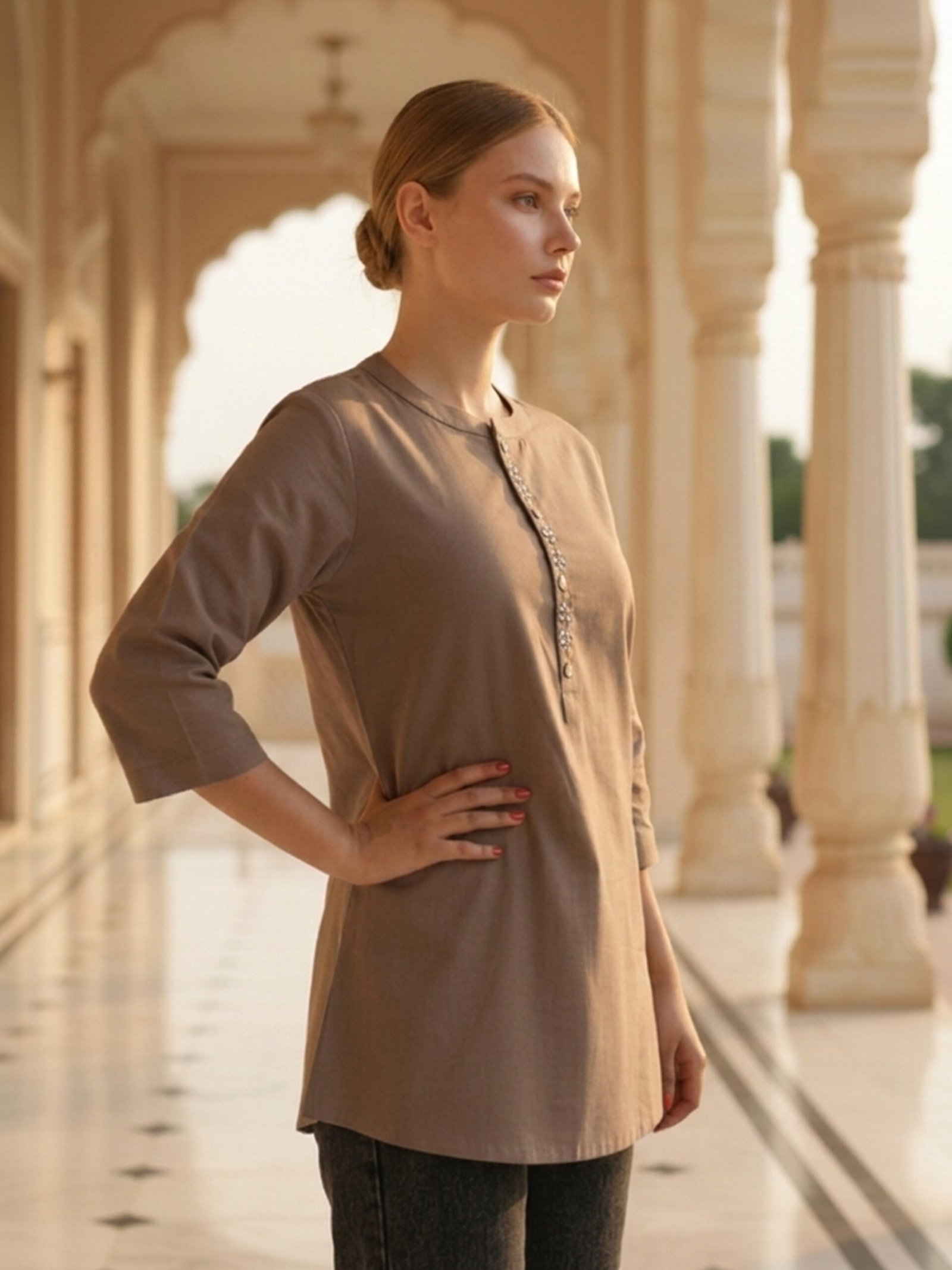 Refresh your daily rotation with this premium neutral taupe tunic. Designed with a focus on ease and movement, the flared silhouette offers a highly flattering, comfortable fit for all body types. The minimalist embroidery adds just the right amount of texture to the neckline. It is a wardrobe essential that guarantees you look put-together with zero effort, perfect for running errands or casual weekend brunches.