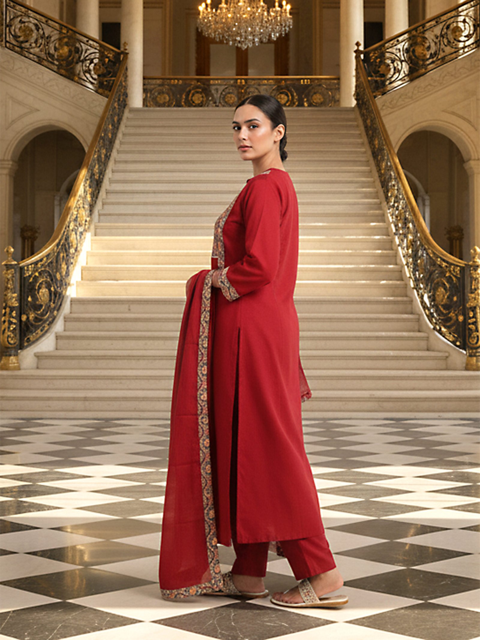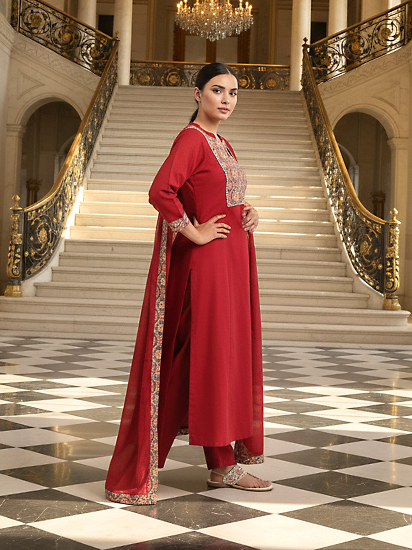 Celebrate in bold, striking style with this eye-catching red festive suit set. Crafted in a rich, highly saturated crimson hue, this ensemble features heavy, sophisticated metallic gold embroidery that adds incredible texture and shine. Complete with perfectly matched trousers and a beautifully bordered dupatta, this outfit guarantees you look effortlessly put-together and festive from every angle.