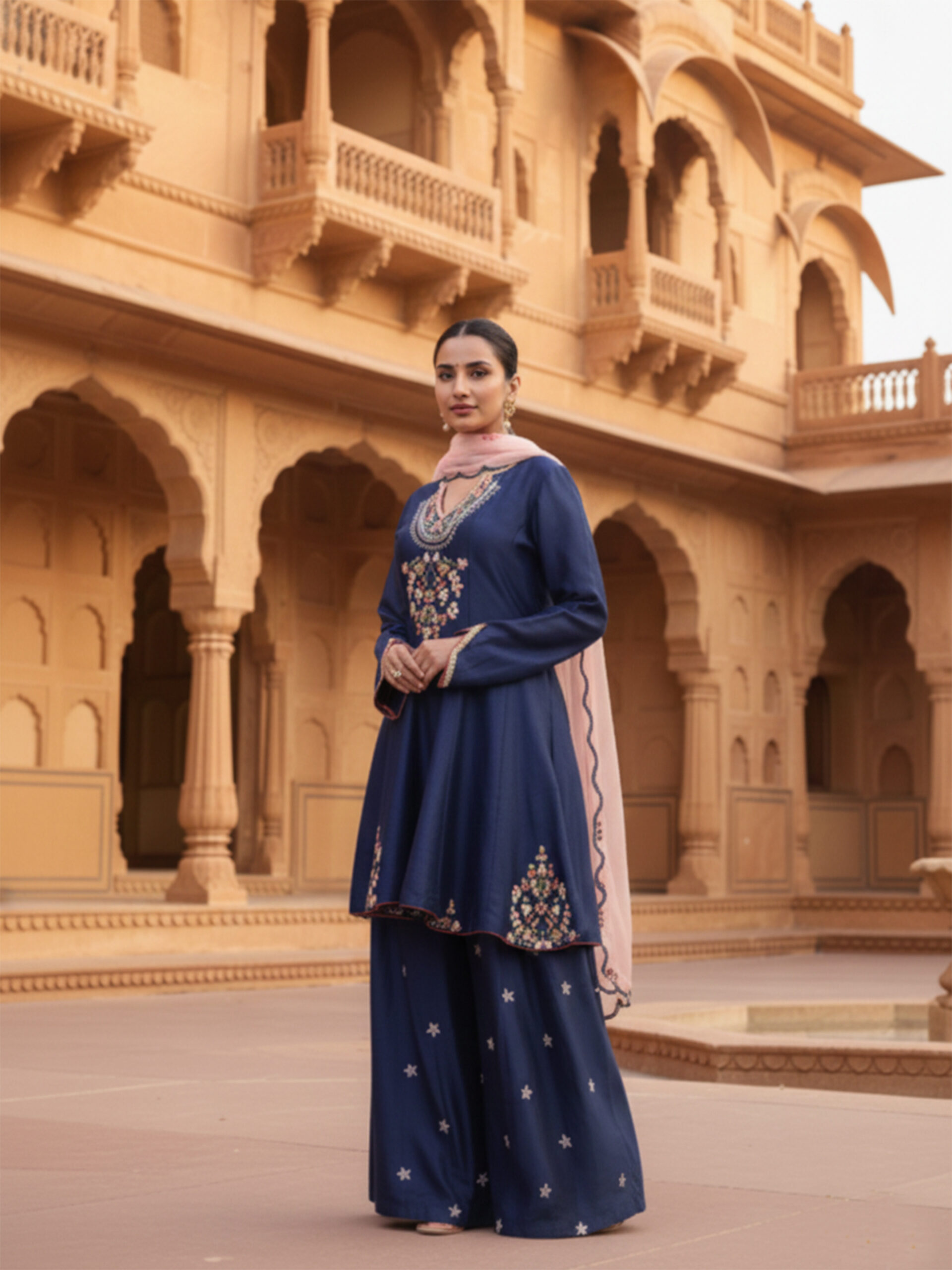 A statement of timeless luxury and regal refinement, the Zafira Noir Royale Embroidered Kurta Set is designed for women who appreciate heritage craftsmanship elevated to couture elegance. Rich textures, intricate embroidery, and a commanding colour palette make this ensemble truly unforgettable.